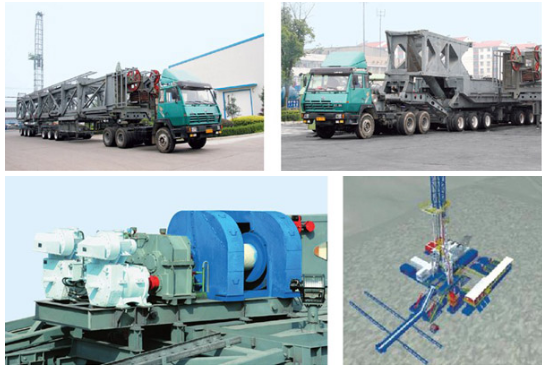 ● It is easy and convenient for integral transportation and installation. The drilling rig can be put into installation position on well site only by six trailers, fast for installation without crane.